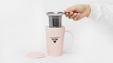 Brew GelMoment Tea easily with our new Ceramic Tea Mug! This 12-ounce mug comes with a fine stainless-steel infuser and a lid that doubles as a saucer. Packed in a beautiful gift box!